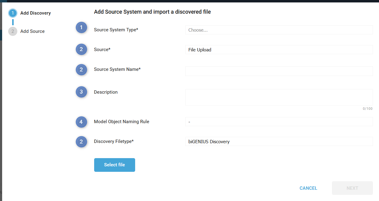 - Select File: opens a file browser window where you can select the Discovery File from your local system.