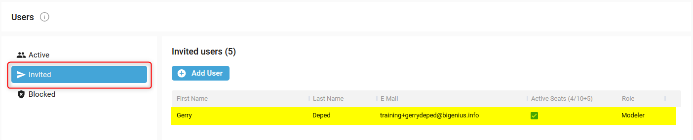 - The new User appears in the Invited User list: