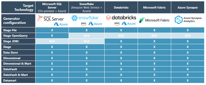 The following Generator Configurations are available in biGENIUS-X (grouped by Generator Group and Target Technology):
