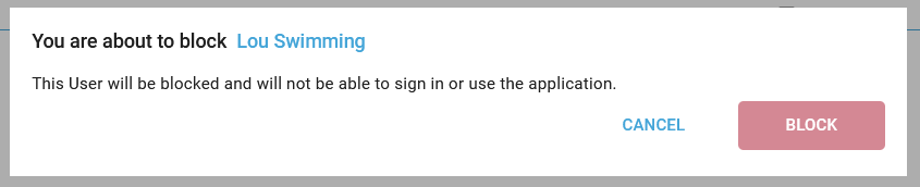 The You are about to block pop-up is opened with the User Name: