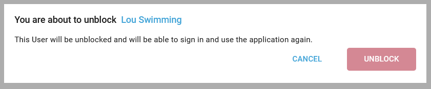 The You are about to unblock pop-up is opened with the User Name: