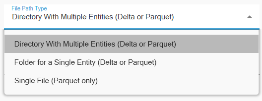 - Directory With Multiple Entities (Delta or Parquet): the path to the folder containing all the entity's folders