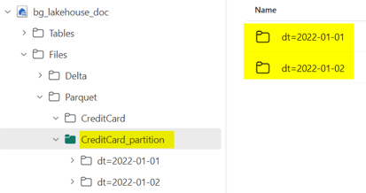 - Example: bg_lakehouse_doc.Lakehouse/Files/Parquet/CreditCard_partition