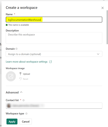 In this example, we will create a Workspace named bgDocumentationWarehouse.
