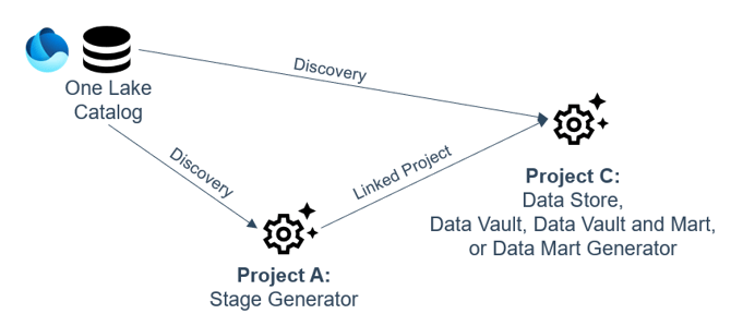 - using a direct Discovery in a dedicated Project using the Generator Configuration Microsoft Fabric Warehouse Stage, Data Store, Data Vault, Data Vault and Mart, or Data Mart