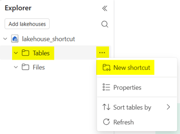 In the Tables folder, click on the context menu and choose New shortcut: