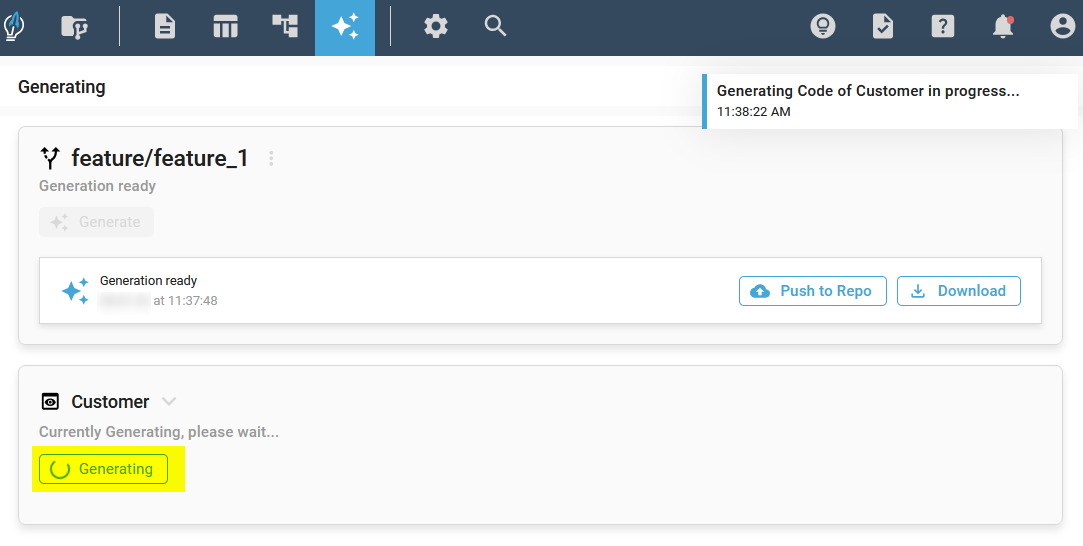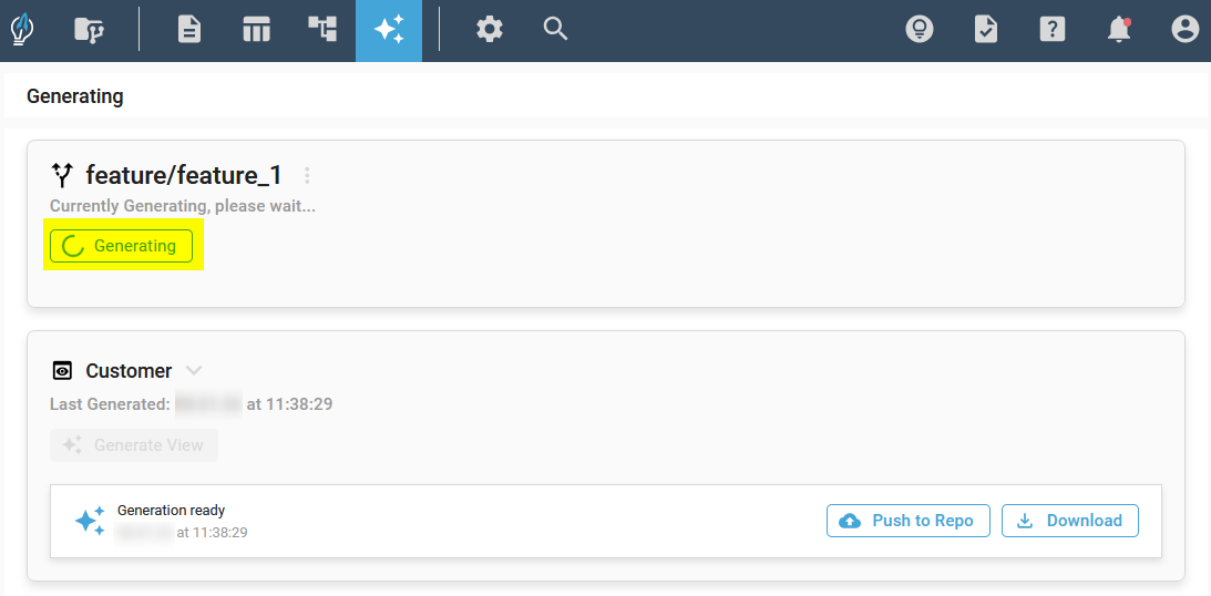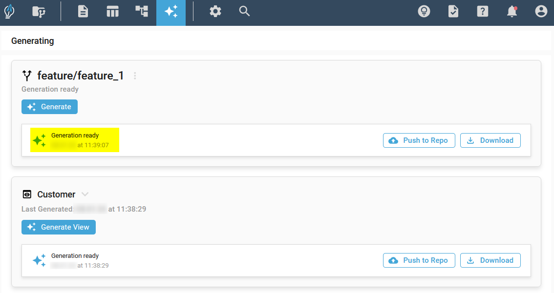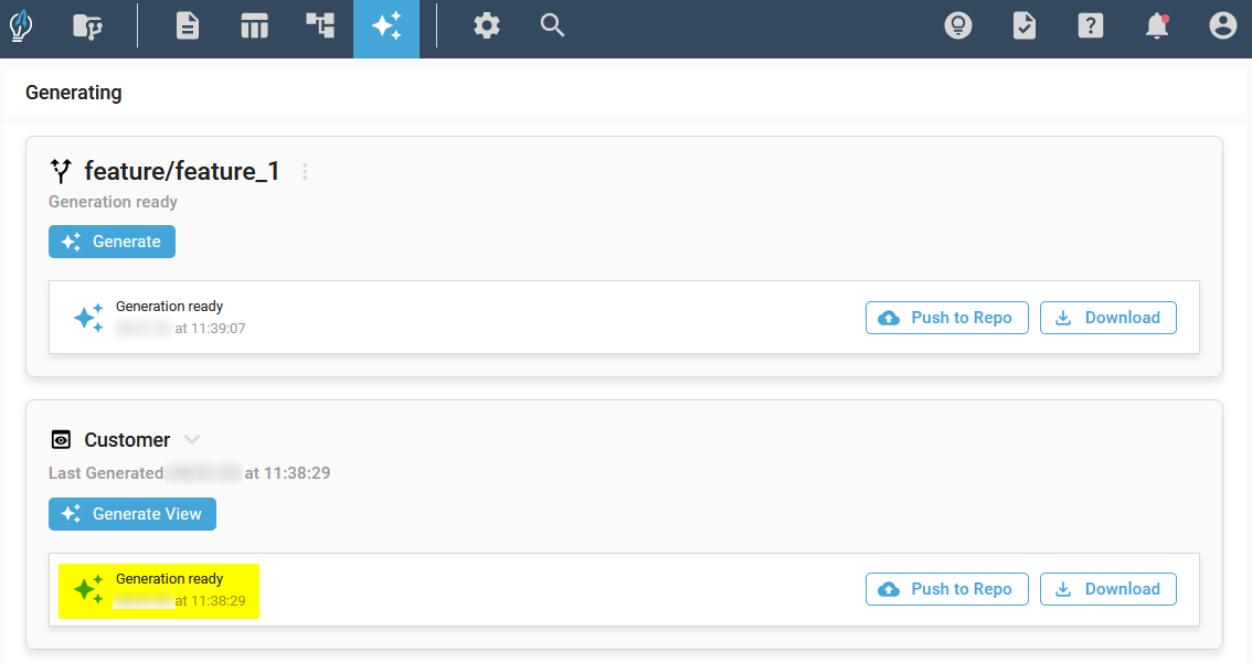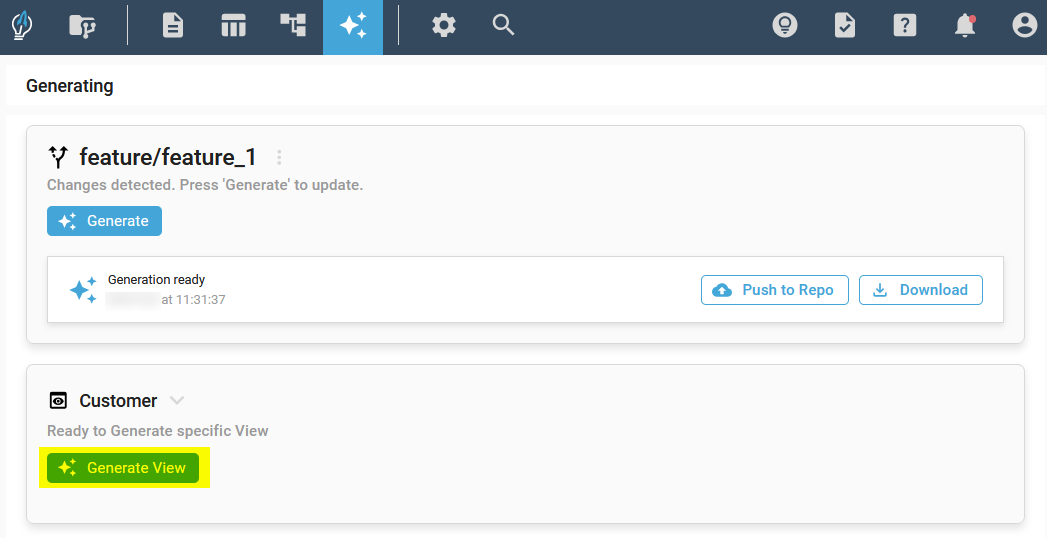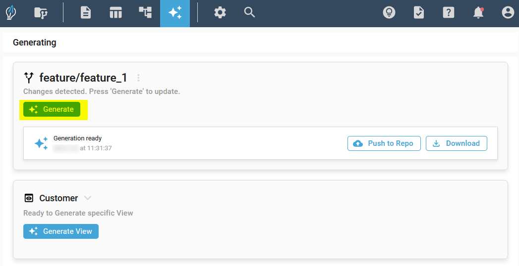 - To generate artifacts from a specific Feature Branch (all the existing Model Objects), access the Generation overview page of a Project: