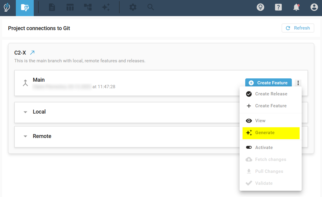 - On the Branch overview page of a Project, you can generate the Local Main Branch (all the existing Model Objects) by clicking on the Context menu and choosing the Generate option:
