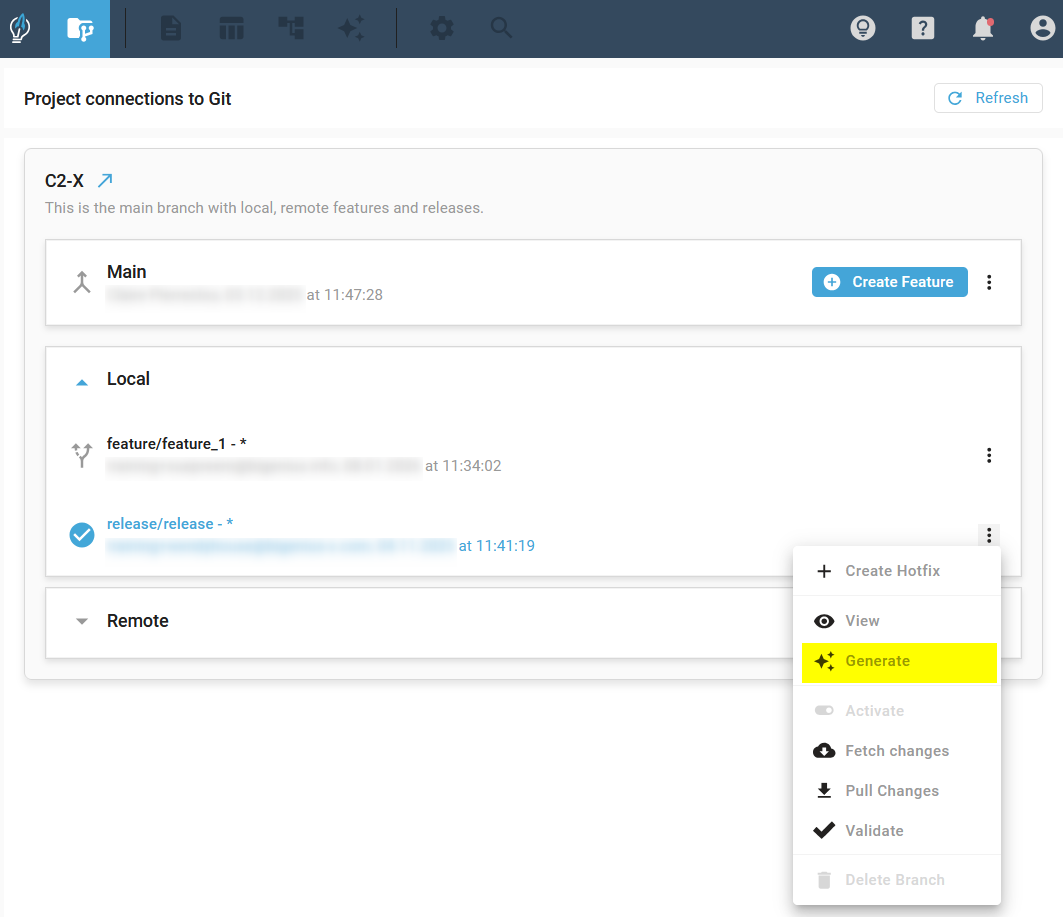 - On the Branch overview page of a Project, you can generate a Local Release Branch (all the existing Model Objects) by clicking on the Context menu and choosing the Generate option: