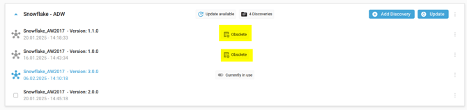 If a Discovery was created from a Data Marketplace Data Product, and the Data Contract version used in the Discovery is marked as obsolete in the Data product, the tag Obsolete appears near the Discovery.