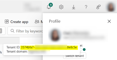 - Azure tenant ID: you can find it in Fabric by clicking under your profile picture in the top right-hand side, then hovering over the i icon near the Tenant name: