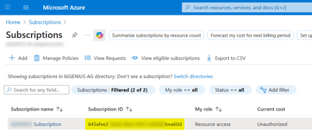 - Subscription ID: you can find it by signing into the Azure portal, then navigating to the "Subscriptions" section under Azure services