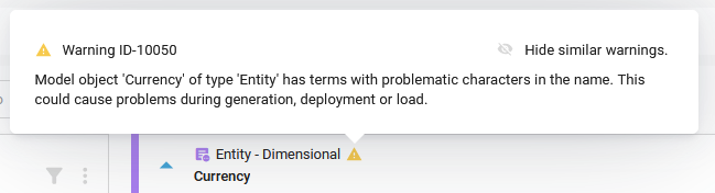 Model object '{ModelObject.Name}' of type '{ModelObject.ModelObjectType.Name}' has terms with problematic characters in the name. This could cause problems during generation, deployment or load.