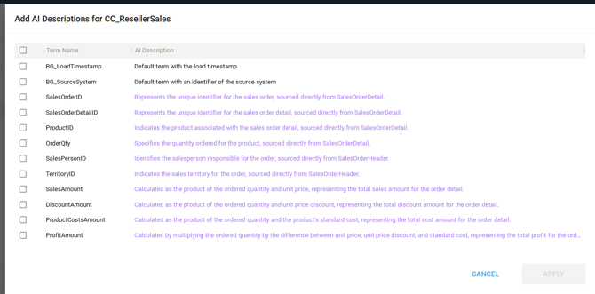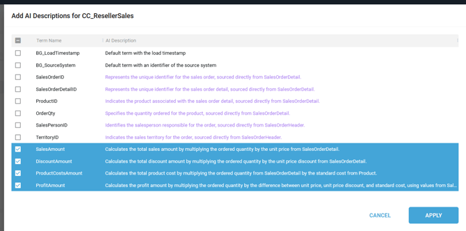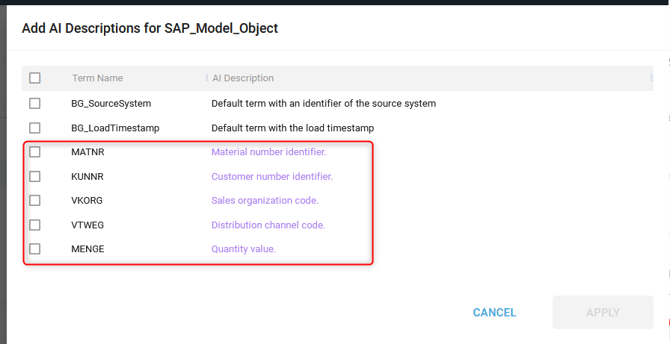 biGENIUS-X term description with AI supports the coded SAP term names and can produce the descriptions in natural language: