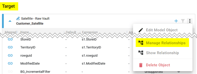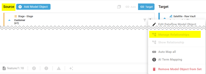 - Access the Manage Relationships page for the Source or Target Model Object