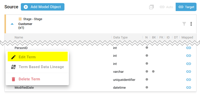 - Filter the Source or Target Model Object Terms to display the Business Keys, the Foreign Keys, the Default Terms, the Identities, the Business Attributes, the Mapped, or the Unmapped Terms.