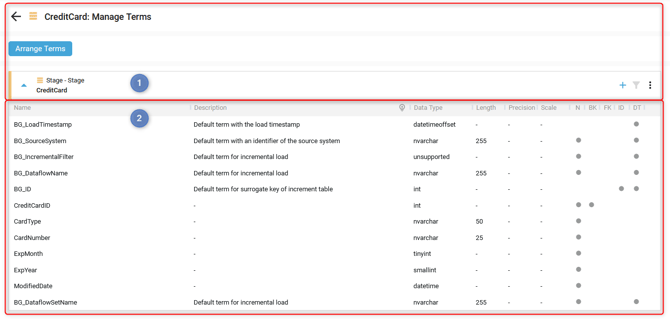 In the Terms overview content, the list of Terms of the Model Object with the following information for each Term is displayed: