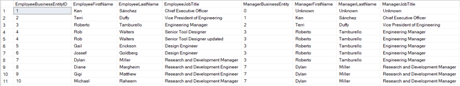 After generating, replacing the placeholders, deploying, and loading the data, the following statement can be executed to have the flattened view of the employee-manager relation: