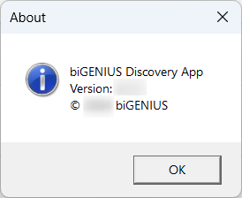 - About biGENIUS Discovery App: opens a pop-up with the version details: