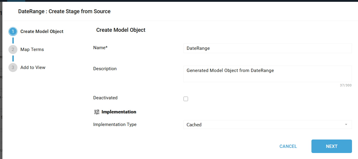 The steps to create a Model Object with the wizard vary based on the Source and Target Model Object types. This article outlines a possible wizard step.